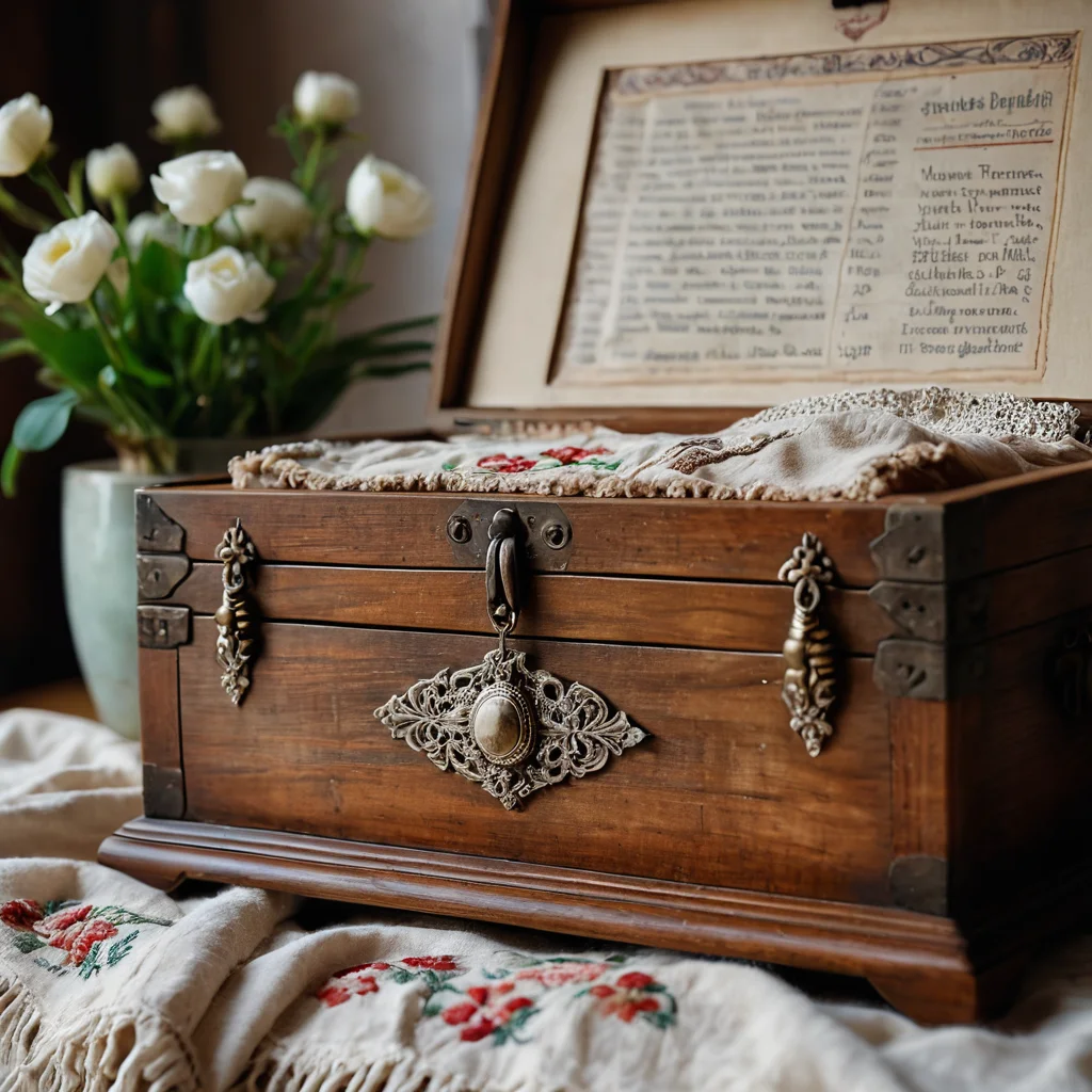 dekor-kotoryi-rasskazyvaet-istoriu-vashei-semi_istoriya-v-veschah-kak-vybrat-semeinye-relikvii-dlya-dekoraСохранить или поделиться: ← Листайте фото свайпом или стрелками →Крупный план старинного деревянного сундука, открытого и наполненного семейными реликвиями: вышитые ткани, старые письма, серебряный медальон, олицетворяющий историю семьи.