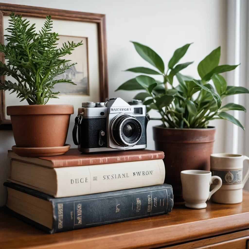 dekor-kotoryi-rasskazyvaet-istoriu-vashei-semi_sekrety-kompozicii-kak-garmonichno-vpisat-lichnye-istorii-v-Сохранить или поделиться: ← Листайте фото свайпом или стрелками →Элегантная интерьерная композиция на полке: винтажная камера, стопка книг, небольшой цветок и фотография в рамке, гармонично вписанные для создания ощущения личных историй.