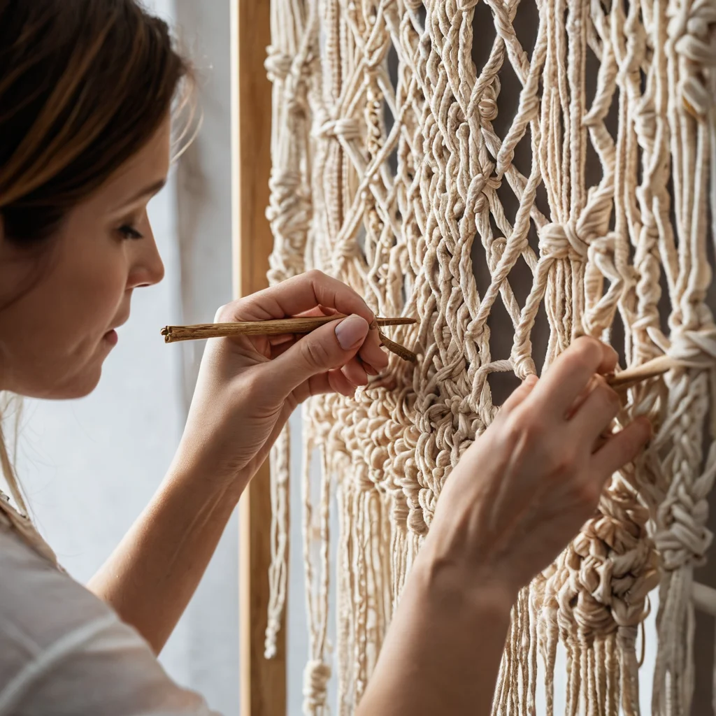 Мастер-класс по созданию макраме-панно: руки мастера аккуратно плетут сложные узоры из хлопковых нитей, следуя эскизу, на фоне готовой части панно, демонстрируя пошаговый процесс воплощения дизайна от идеи до завершения, с акцентом на детали и творческий подход к узелковому плетению.