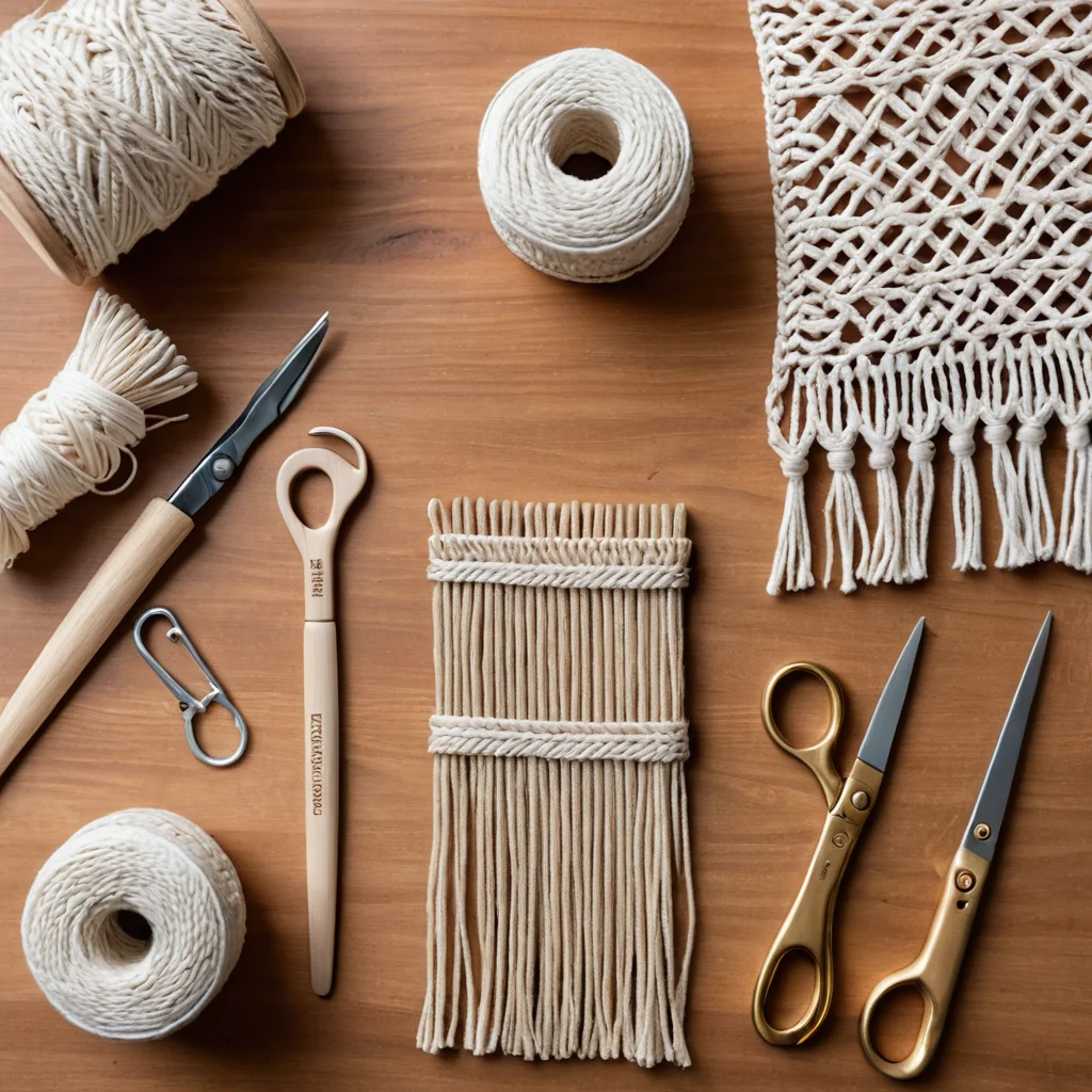 Крупный план разнообразных материалов и инструментов для макраме: натуральные хлопковые нити разных толщин, деревянная палка-основа, острые ножницы, измерительная лента, расческа для бахромы, расположенные на деревянном столе, идеальный набор для начинающих мастеров макраме.