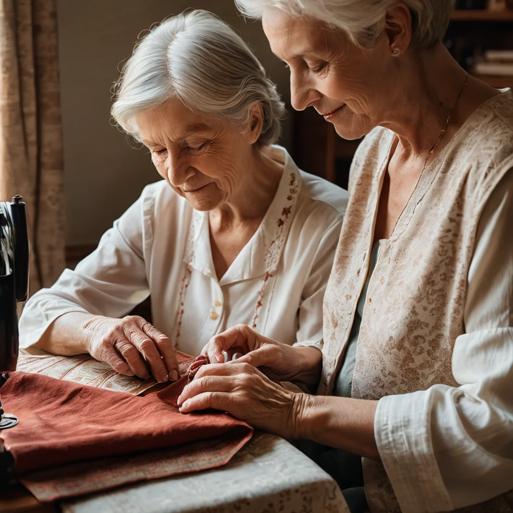 Трогательное изображение рук бабушки и внучки, вместе занимающихся рукоделием, с незавершенными нарукавниками. Это символизирует передачу традиционных ценностей, возрождение интереса к ручному труду и преемственность поколений в создании уютных вещей.
