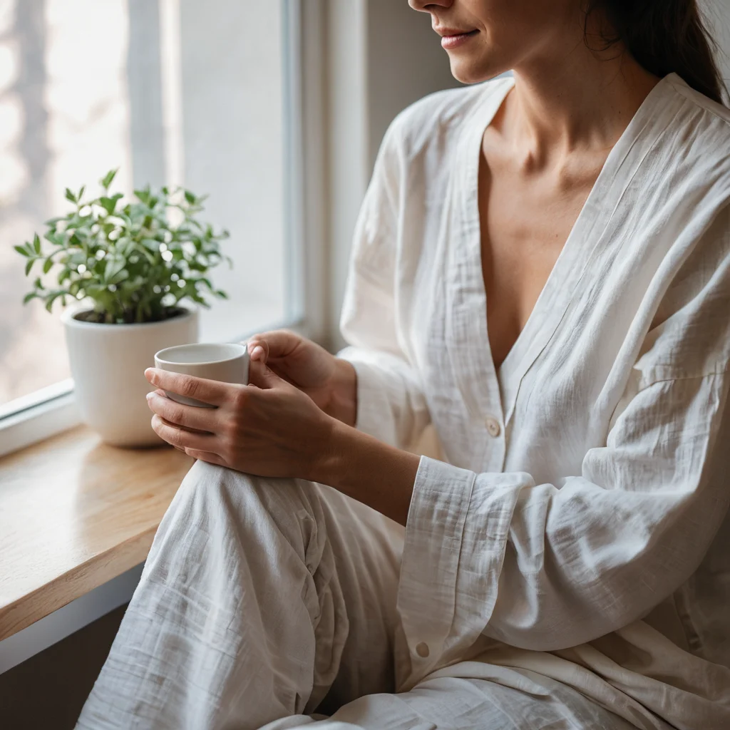 narukavniki-dlya-zaschity-odezhdy_narukavniki-kak-akt-zaboty-filosofiya-osoznannogo-uhoda-za-vСохранить или поделиться: ← Листайте фото свайпом или стрелками →Изображение демонстрирует руки, нежно поправляющие льняные нарукавники, что символизирует осознанный уход за одеждой и акт самозаботы в уютной домашней обстановке. Фокус на текстуре натуральной ткани и мягком утреннем свете.