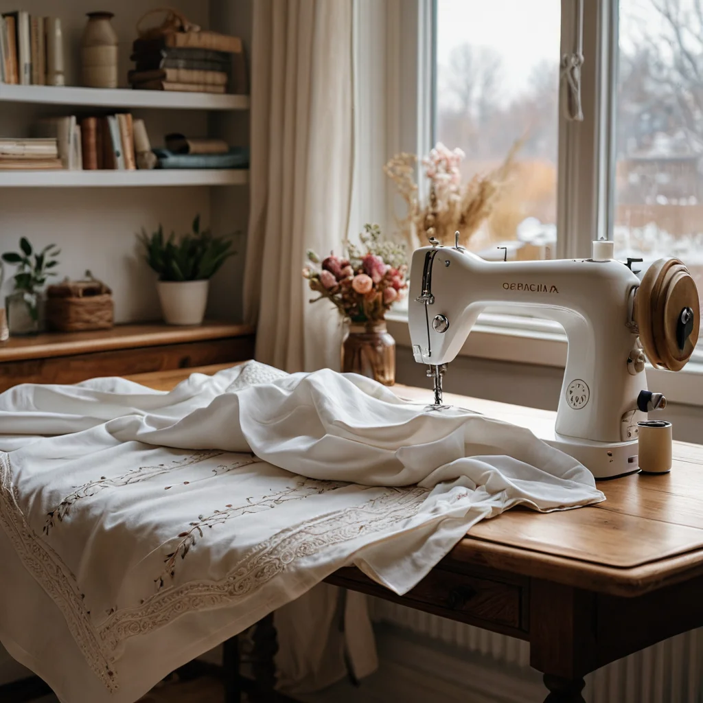 Изображение показывает руки мастера в процессе пошива нарукавников, демонстрируя различные техники: от простого подгиба до изысканной вышивки. На столе разложены иглы, нитки и образцы ткани, подчеркивающие разнообразие мастерства в создании функционального аксессуара.