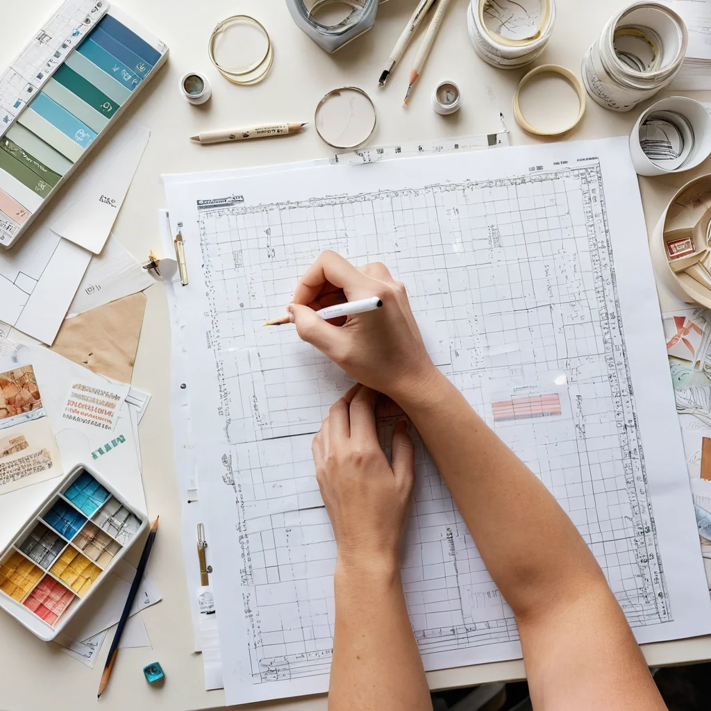 Подготовленное рабочее пространство с разложенными элементами для скрапбукинга на белой картонной основе, демонстрирующее процесс организации композиции первой страницы фотоальбома, с учетом базовых принципов и эскизных линий.