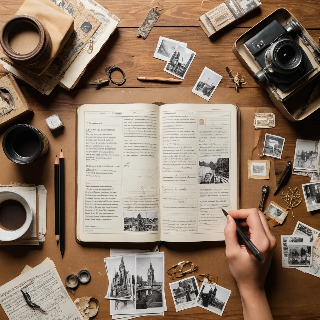 skrapbuking-sozdanie-pervoi-stranicy-dlya-fotoalboma_poshagovyi-process-etap-1-ot-idei-k-eskizu-vybor-foto-temy-iСохранить или поделиться: ← Листайте фото свайпом или стрелками →Крупный план рук, делающих эскиз-макет первой страницы скрапбукинг-альбома в блокноте, рядом разложены фотографии, образцы бумаги и элементы вдохновения, демонстрирующие этап выбора фото и темы.