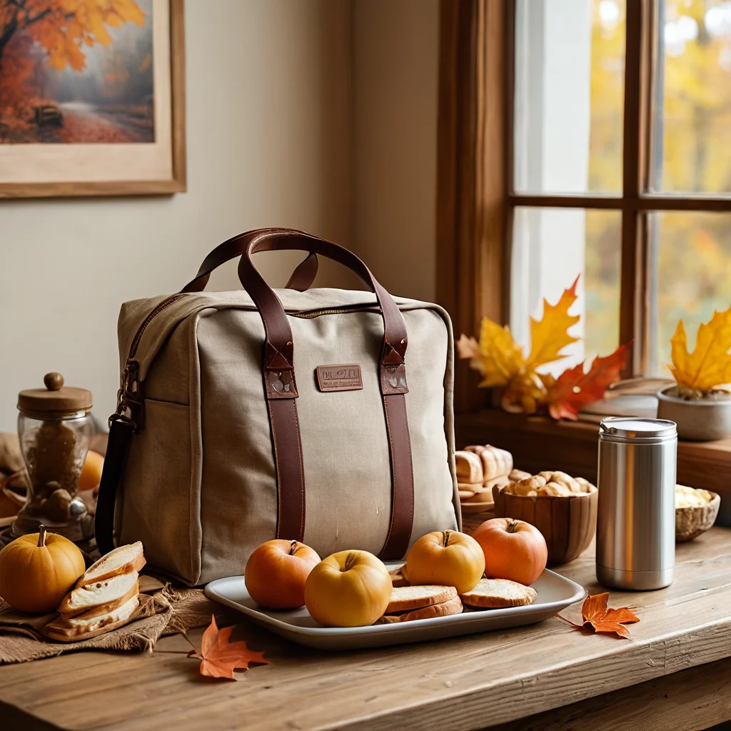 Полностью готовая термосумка ручной работы стоит на уютном деревянном столе в домашней обстановке, наполненная свежими домашними угощениями и термосом. Мягкий, теплый свет подчеркивает ощущение уюта и удовлетворения от завершенного проекта, вдохновляя на новые ремесленные идеи и символизируя тепло дома и ручного творчества.